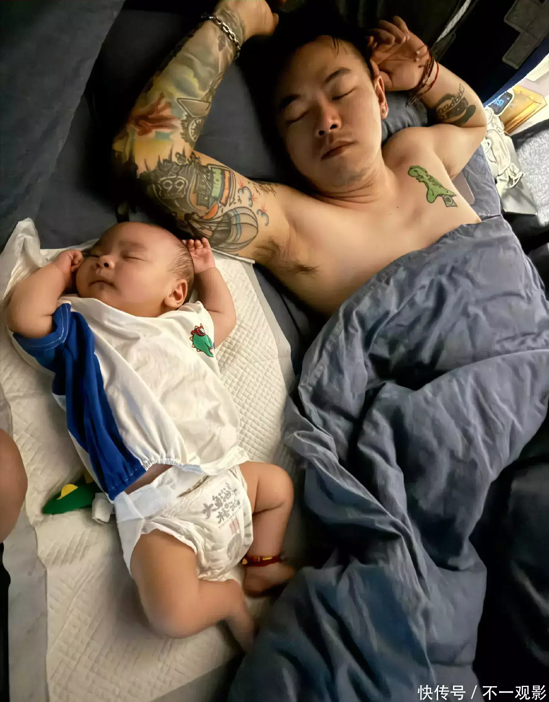 而父子俩的睡姿亦然如出一辙,只不外小阿布看起来更可儿,爸爸王皓则略显轻率。