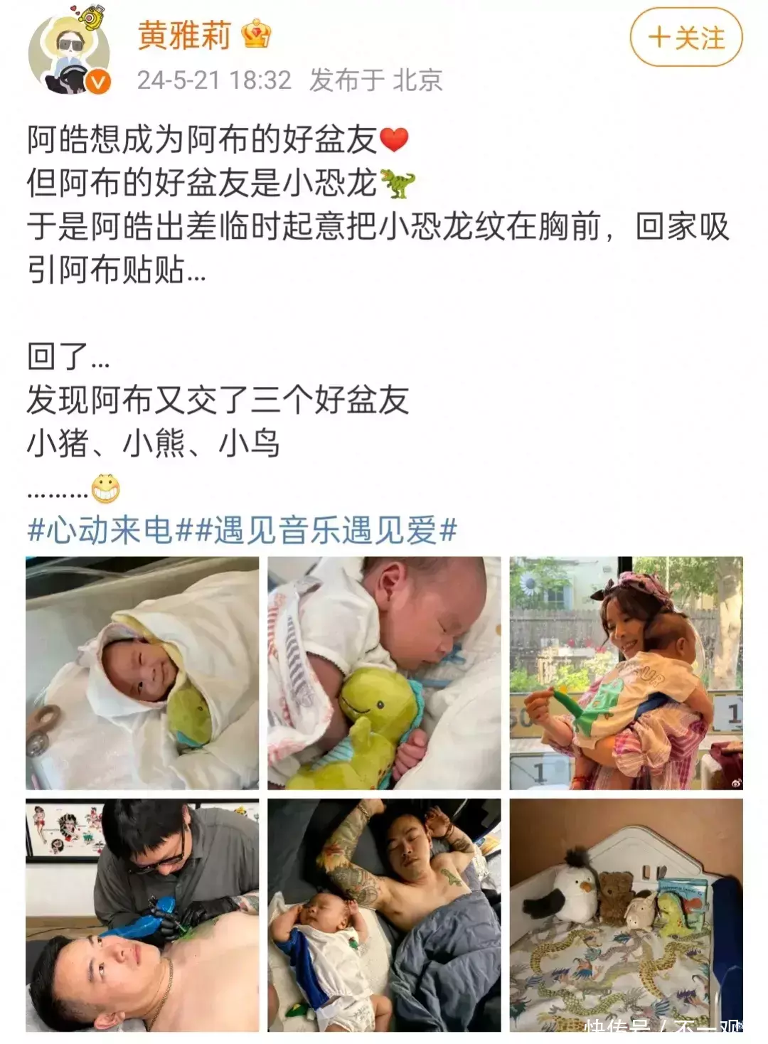 黄雅莉发文写谈:“阿皓念念成为阿布的好盆友,但阿布的好盆友是小恐龙,于是阿皓出差临时起意把小恐龙纹在胸前,回家诱导阿布贴贴……回了……发现阿布又交了三个好盆友,小猪、小熊、小鸟。”