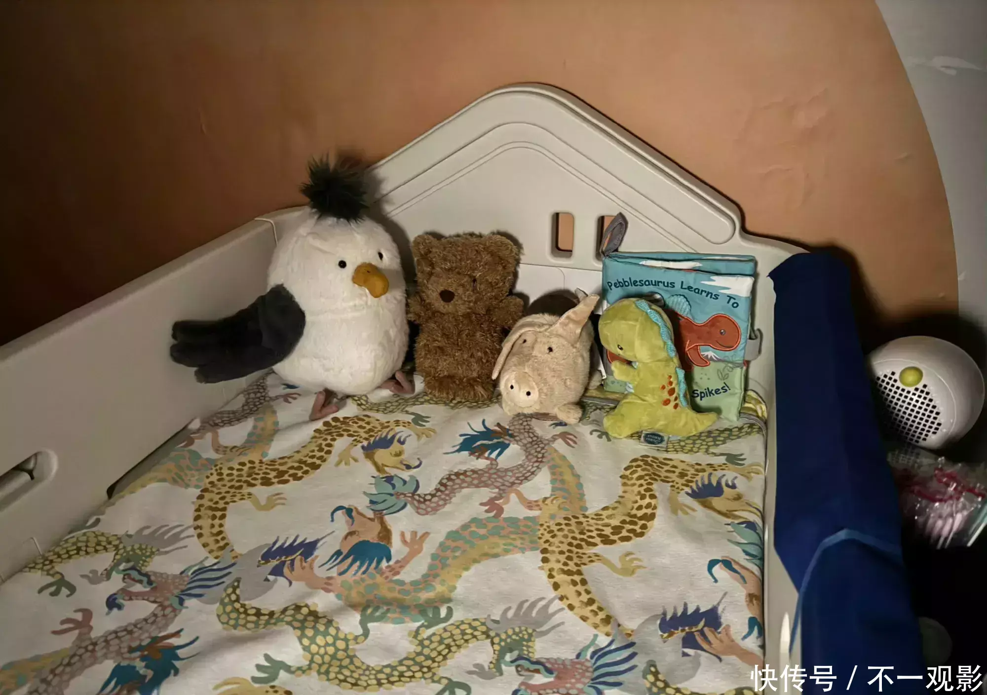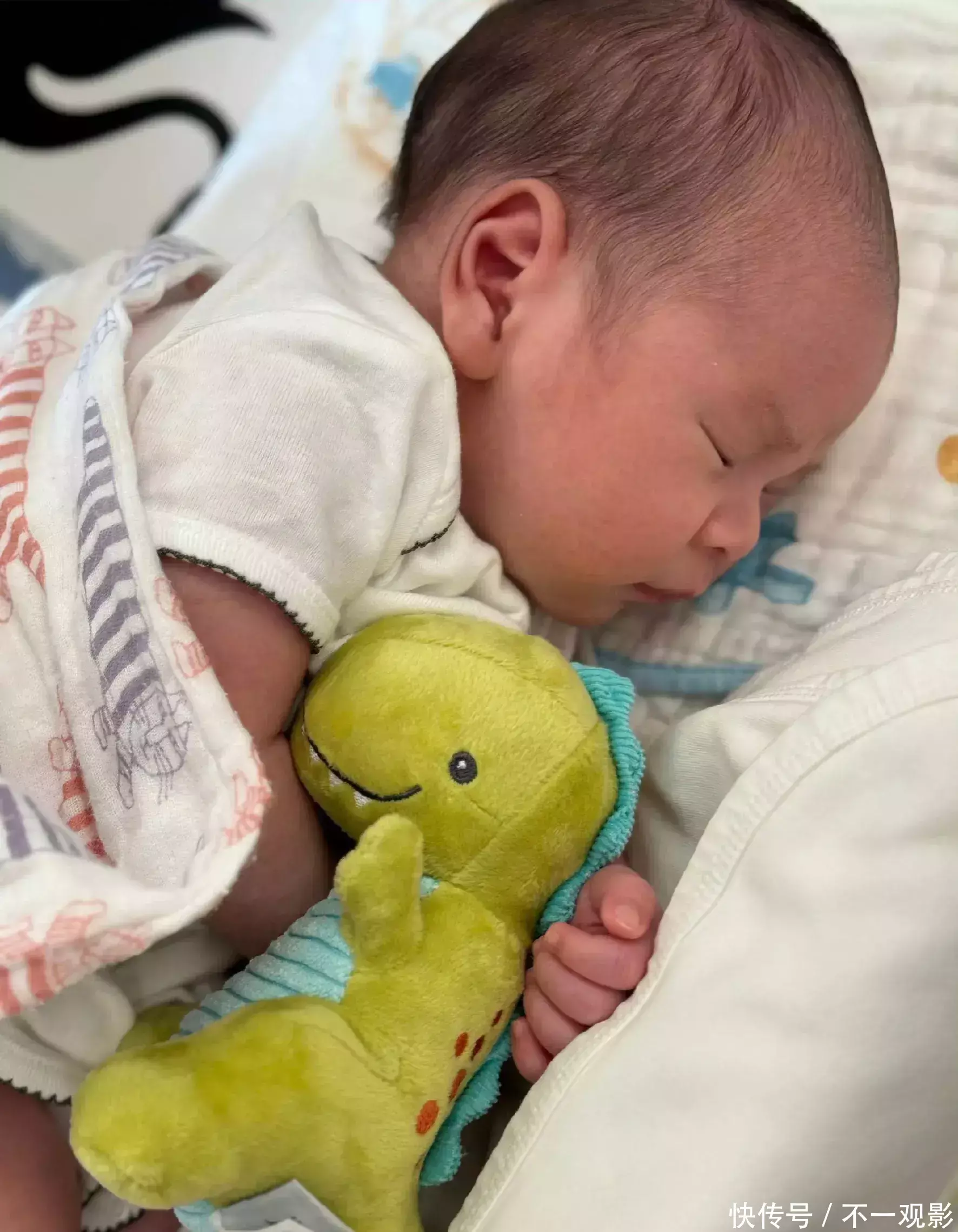 抱着恐龙玩偶睡着的小阿布,看起来小小的一只,软萌软萌的,能把姆妈的心萌化的那种。