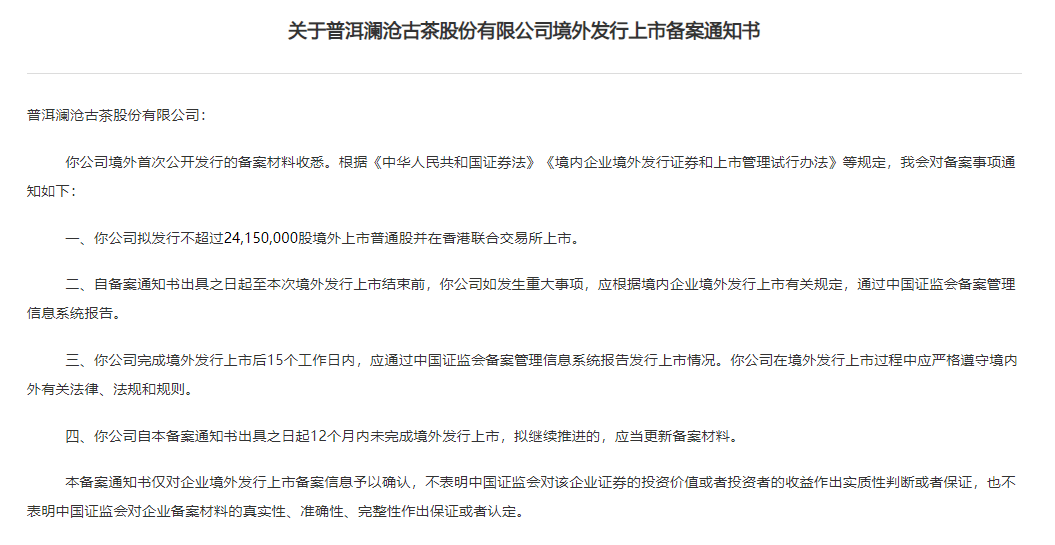 金卡戴珊视频8月2日,据证监会备案见知书,澜沧古茶咫尺已完成赴港上市备案,拟刊行2415万股境外上市普通股并在港交所上市。